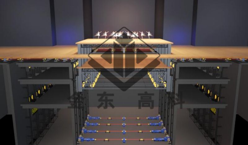 •設(shè)備功能及運(yùn)行:主升降臺(tái)功能有二,其一運(yùn)行至地下臺(tái)倉(cāng),運(yùn)送演員或道具至舞臺(tái)面。其二運(yùn)行至高出舞臺(tái) 面,行程高臺(tái)或臺(tái)階狀的表演平面。豐富表演層次,快速完成場(chǎng)景切換。